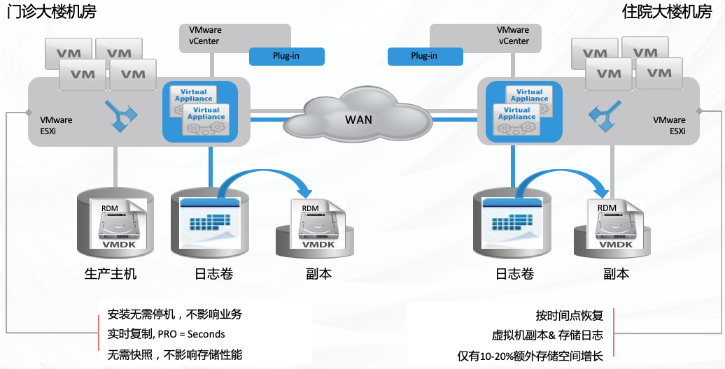 院区内两个机房需要协同保障业务连续性,同时要能防范因人为误操作导致 重大损失的灾难,并能决速恢复系统。